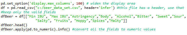 K-Means clustering is an unsupervised modeling technique. Here I will be using the beer_data_set.csv dataset from Kaggle. Using this data I am going to classify the beers into five clusters according to the fields "Min IBU", "Max IBU","Astringency","Body", "Alcohol","Bitter", "Sweet","Sour","Salty", "Fruits", "Hoppy","Spices" and "Malty"