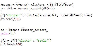 And finally, having a look at the clusters attached to the original dataset, we can see that different styles of beers would be clustered together. This would indicate that if a person likes a certain type of beer, that person might also like another beer in a different style that has some similar taste profiles.