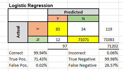 The overall accuracy of the model can be calculated as (71,071 + 85) / (71,071 + 85 + 12 + 34) = 99.93% At first glance, this sounds great, but we only have 119 fraudulent transactions out of a total of 71,202. Thus our base accuracy rate, if we classified every transaction as “no fraud,” would be 99.84%