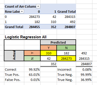 More importantly, would be the false positive and true positive accuracy. Without a model, if we classified every transaction as “non-fraudulent”, we would have an overall accuracy of 99.84%, but a False Positive and True Positive rate of 0%