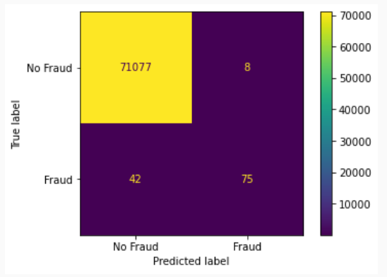 The confusion matrix has two axes. A “true” axis and a “predicted” axis. We have 75 instances where the True and Predicted labels indicate a fraudulent transaction. The model predicted a fraud, and there was an actual fraud. There were 71,077 instances where the model predicted “No Fraud” and there was actually no fraudulent transactions.