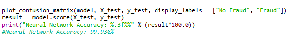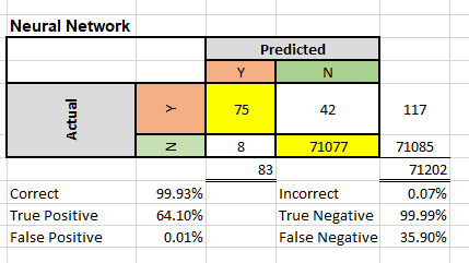 The overall accuracy of the model can be calculated as (71,077 + 75) / (71,077 + 75 + 8 + 42) = 99.93% At first glance, this sounds great, but we only have 117 fraudulent transactions out of a total of 71,202. Thus our base accuracy rate, if we classified every transaction as “no fraud,” would be 99.84%